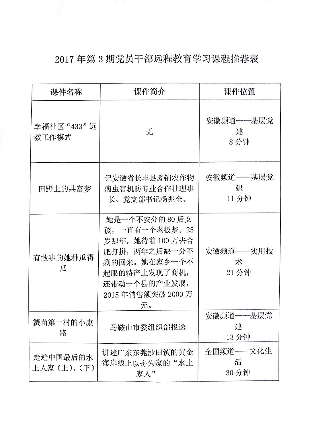2017年第3期《党员干部远程教育学习课程推荐表》